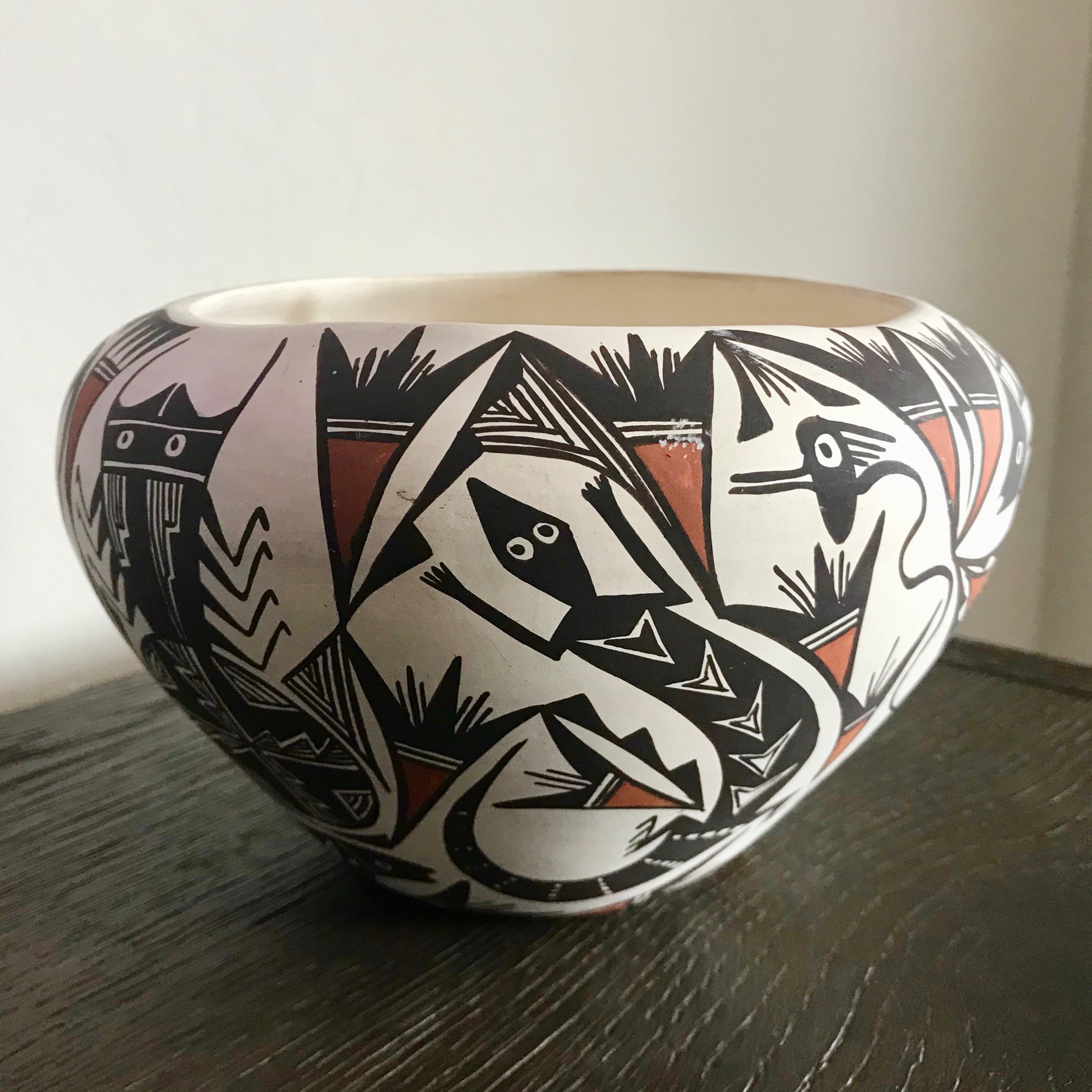 Today I followed up on a piece of pottery I have owned for around 30 years at least.  My mom brought it back from one of her many trips to Arizona.  She told me not to throw it away or just get rid of it because it was very expensive.  It is signed on the bottom, so I googled the name.  To my surprise, this pottery may be from New Mexico rather than Arizona.  The artist is P. Iule Acoma Designs.  Apparently the Iule family are all artists in pottery, silver, and turquoise.  The P stand for Phillip, and his style seems to be these animals and bugs rather than geometric designs you see on a lot of Native American pottery.  I love this piece, and thought it was most appropriate to bring to Arizona from Missouri.  Since my mom is no longer with us, I cannot ask her if she bought this in Arizona or New Mexico.  It really doesn’t matter, it’s still a beautiful piece of Native American art residing back in the Southwest.