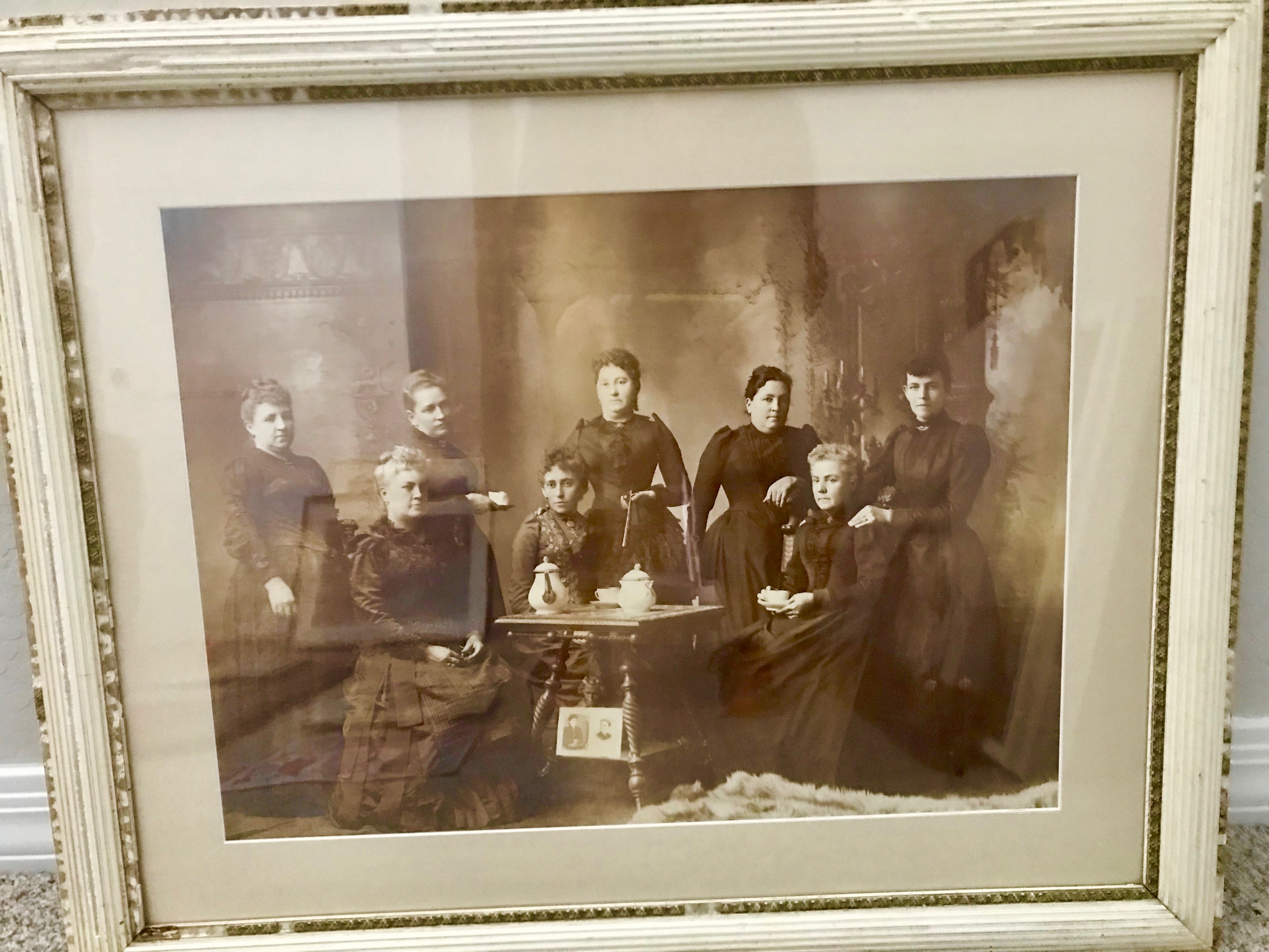 We arrived in Arizona in my car that was loaded with “stuff” for this house, and next week Dennis’ son will be bringing our other car which is an SUV loaded with more “stuff” from Missouri for this house.  Howdy Doody along with my photo is on its way, along with my mom’s camera from the 1940’s—it’s not valued at a lot, but it has a lot of sentimental value to me. All of our vintage photos of our families (mine and Dennis) are here to cover a wall along with a vintage photo of these women who we have no idea who they are.  Dennis’ wife, who passed away, had bought this picture when they lived in Virginia.  It is in its original frame.  Our framer in Missouri, as he re-matted the picture, took a look at it and said that it is an actual photograph.  These women are all dressed in black sitting around a table with a photograph of another woman.  We assume she was part of this group of whoever they were, but possibly deceased.  It’s just such a neat photo.  I am still trying to figure out who they are, so any ideas from those who read this, please let me know.