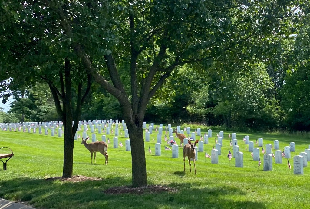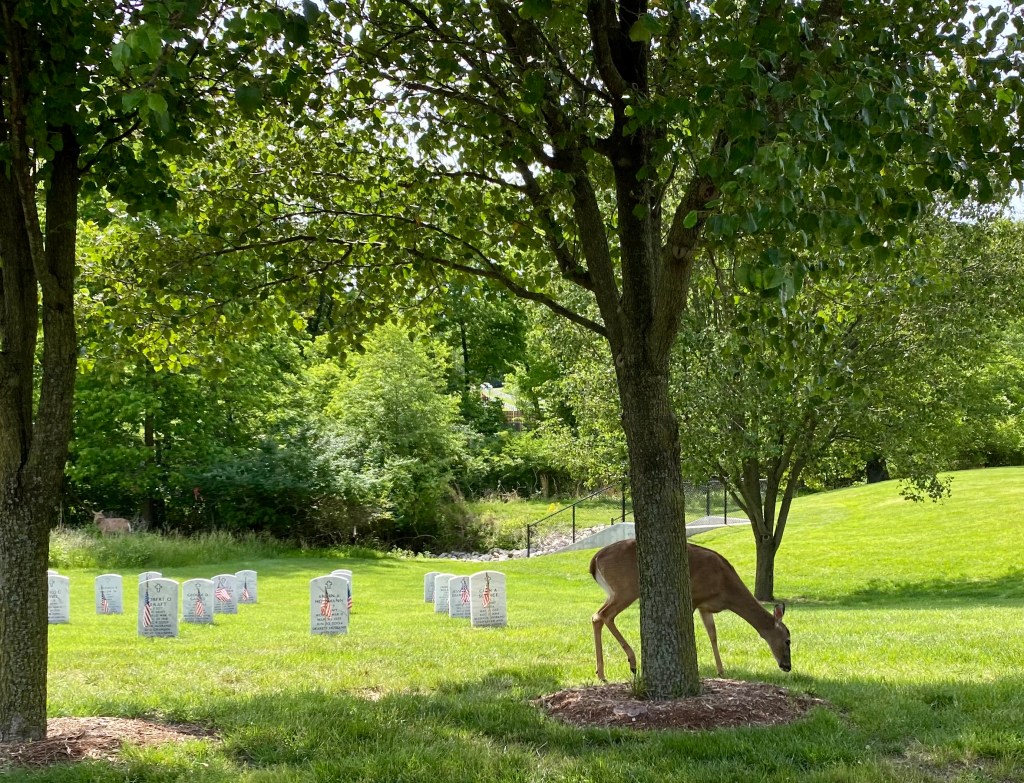 As we were driving through this most impressive cemetery, we spotted the deer that are often seen wandering around the graves. Every grave in this cemetery is numbered with a section letter and number. It is engraved on the back of each tombstone. We were searching for section I. We knew it was towards the back and on top of a hill. Getting there was tricky, so at each intersection I asked the volunteer again so I could find my way.