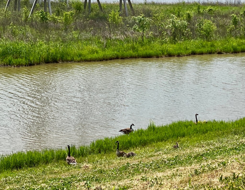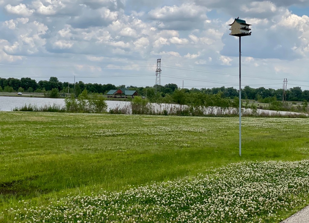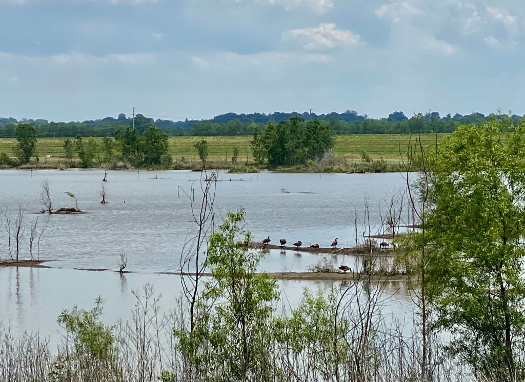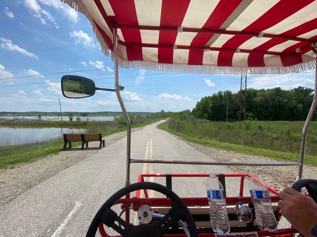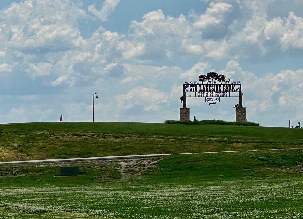Our two weeks were spent at the 370 Lakeside Park. It is a city park owned by the city of St. Peters, and has a whole section for RV camping. This park has a large lake with a walking trail around it. The back side of the lake has protected wetlands. Dennis and I rented a two seater bike (the kind you sit side by side). This bike has two gears—stop and go. We were pretty pathetic peddling around the lake, but it was fun. We love the trail, and this time we had a lot of wildlife to see.