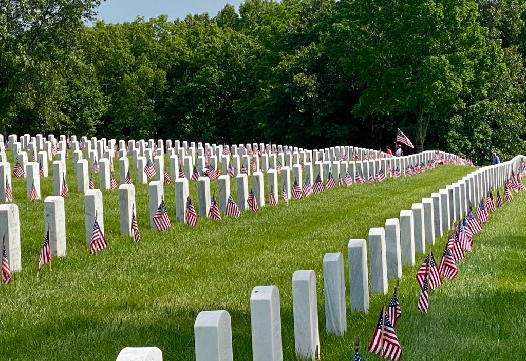 When Memorial Day rolled around, we had no plans. We ran some errands, and then decided to go to Jefferson Barracks National Cemetery. I have been there several times, because this is where my parents are buried. This visit was different because it was Memorial Day. I knew that the Boy Scouts go there Memorial Day Weekend and place an American flag at each grave. I have never been there Memorial Day. As we neared the cemetery the traffic was heavy and it took a while to drive through the entrance. The roads within the cemetery were made one way roads that day, and as one slowly drives around with a long line of cars, there were volunteers at each intersection to help those of us who didn’t know how to get to the area of graves we were searching.