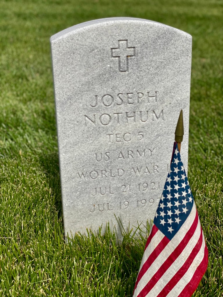 After we stopped at my parents’ graves, we moved on to find my aunt and uncle’s grave (the same aunt and uncle referred in the above story). I knew he was down the hill from my folks. Dennis had a better memory of the location, and I followed him. We had also looked up the grave number, to be sure we were in the correct section. The numbering in this section seemed cockeyed to us, but after much searching, we found Uncle Joe and Aunt Mary’s grave.