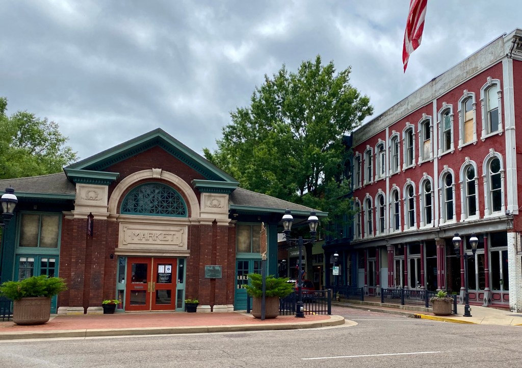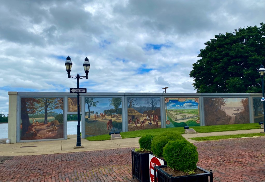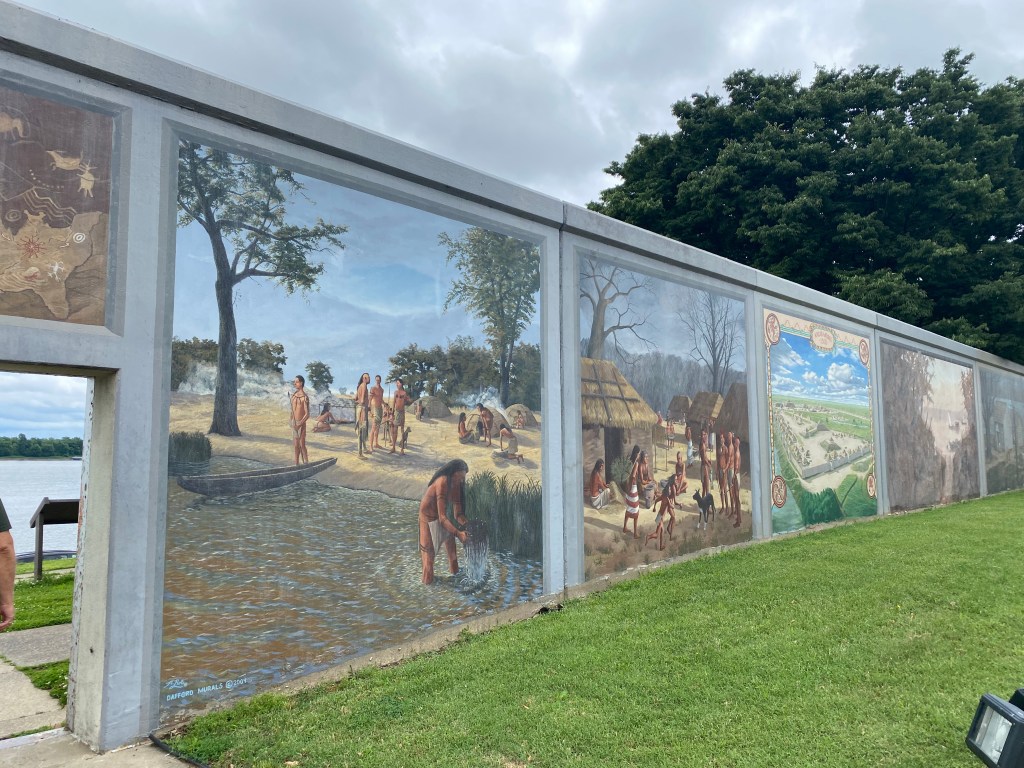 When we left, we walked up the street toward buildings that we could tell have been rehabbed.  There were a couple restaurants and decided to have lunch.  Unfortunately, the quaint little restaurant had mediocre food, but stopping there gave us an opportunity to explore the area.  We were just a block from the Ohio River, and Paducah has a rich history along this river.  We walked down and walked through the opening in what I assume had been flood walls, and took a good look at this large river.  Then we came back and walked along the walls that were painted with murals telling the history of Paducah.