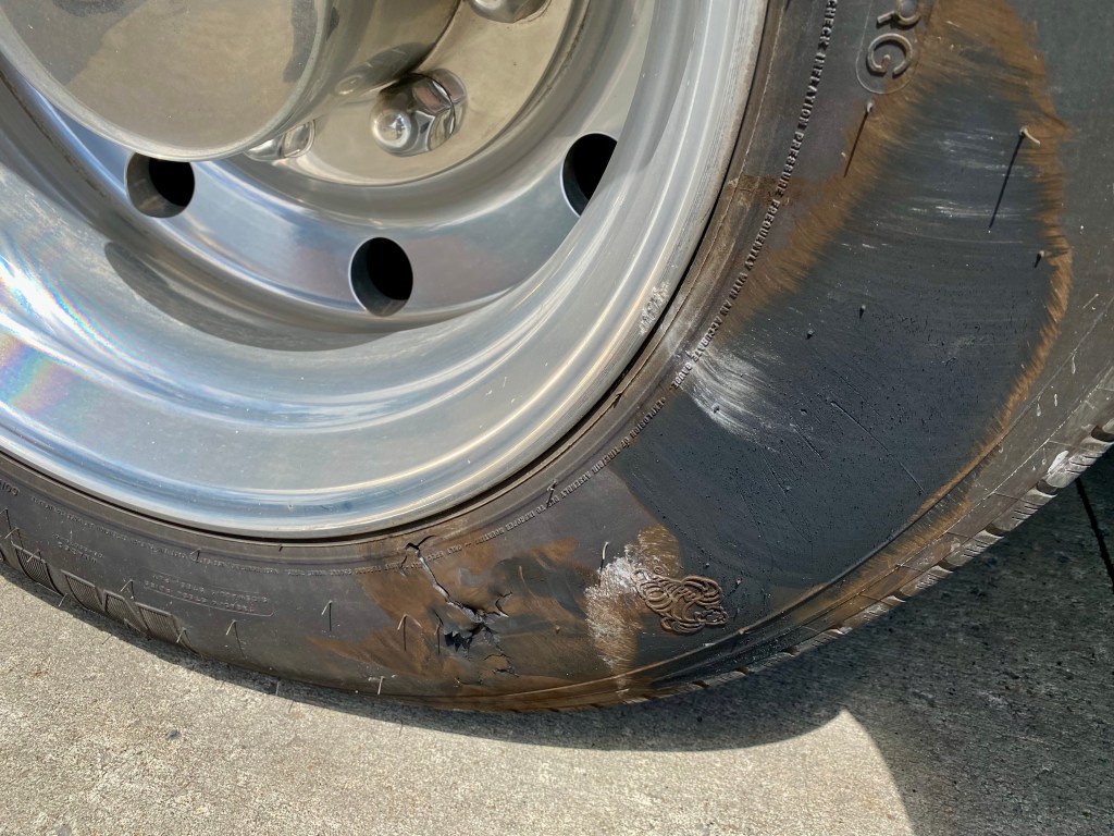 I pulled the car into a parking spot and walked over to the RV to inspect with Dennis any damage we may have had.  There was a cut in the sidewall of the rear tire.  Our hearts sunk.  Knowing that a damaged sidewall could cause a blowout, we knew we couldn’t go any farther until we had the tire replaced.  The brochure from our Paducah RV park had many services listed including a Paducah RV tire service.  We called.  The guy said that he did not have that tire in stock, and even if he got one, it would be two weeks before he could get a certified technician to come to change that large of a tire.  Oh boy, are we in trouble?  Somehow I found a Michelin tire dealer to call.  Don’t ask me how I found this number, because in all that stress, I cannot recall.  A lovely lady named Kathy, gave us the name of two places to call.  No one had the tire.  We called Kathy back and she gave us a couple more names.  Long story short, no one had the tire in stock, but a tire shop in Clarksville, TN said he could get one in by Wednesday morning and change it for us.