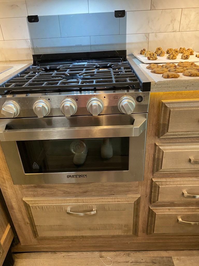 We got the tire changed, and the following day, we headed to Riverside, Alabama for our next RV stop.  We are learning to investigate our RV parks better.  Our park was mostly full-time RVers.  The park sat right on the Coosa River, and there is a really nice dock and boat launch.  Other than that, they had nothing to offer.  We didn’t even have a picnic table.  The slots were narrow and no room for that.  It was our time for R&R anyway, and we could do so without amenities.  One day I worked on mastering the RV oven by baking chocolate chip cookies from scratch.  Three things you need to bake in an RV oven:  1) an oven thermometer (don’t rely on the dial—it lies!); 2) a small square pizza stone (it distributes the heat evenly); and 3) air bake pans.  The only place I could find small air bake pans was from Target, and only online.  I am proud to say, the cookies were baked to perfection, and now are stashed away in the freezer for future desserts or something to feed guests as we travel.