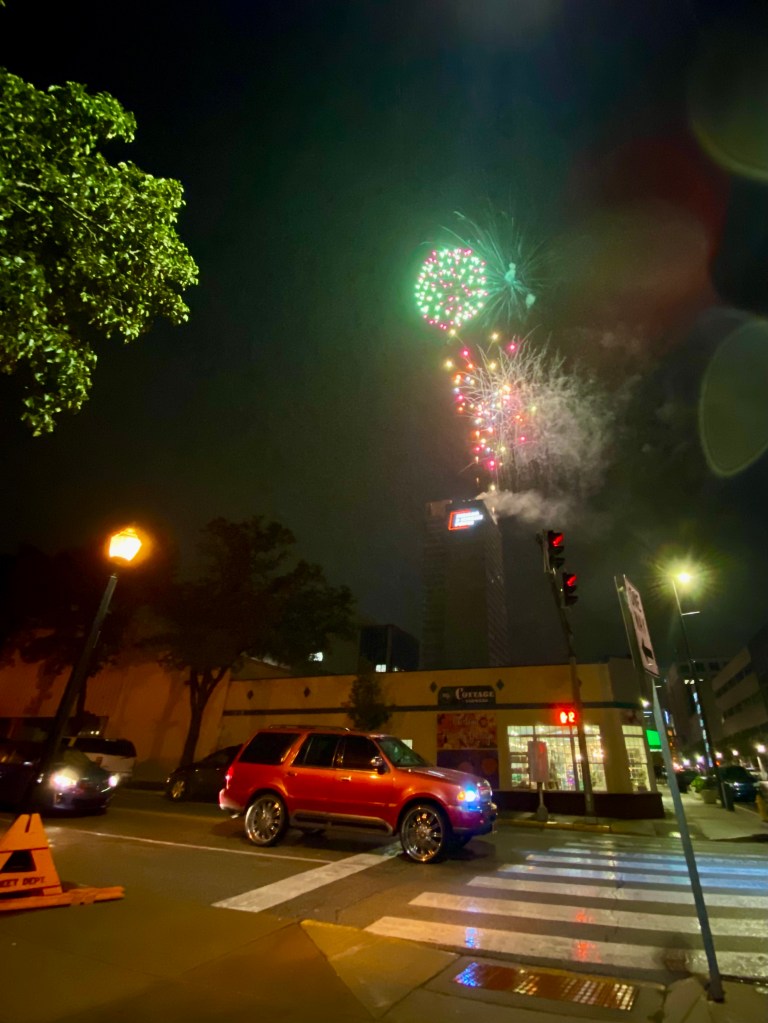 The fireworks are set off from the top of their tallest building downtown/