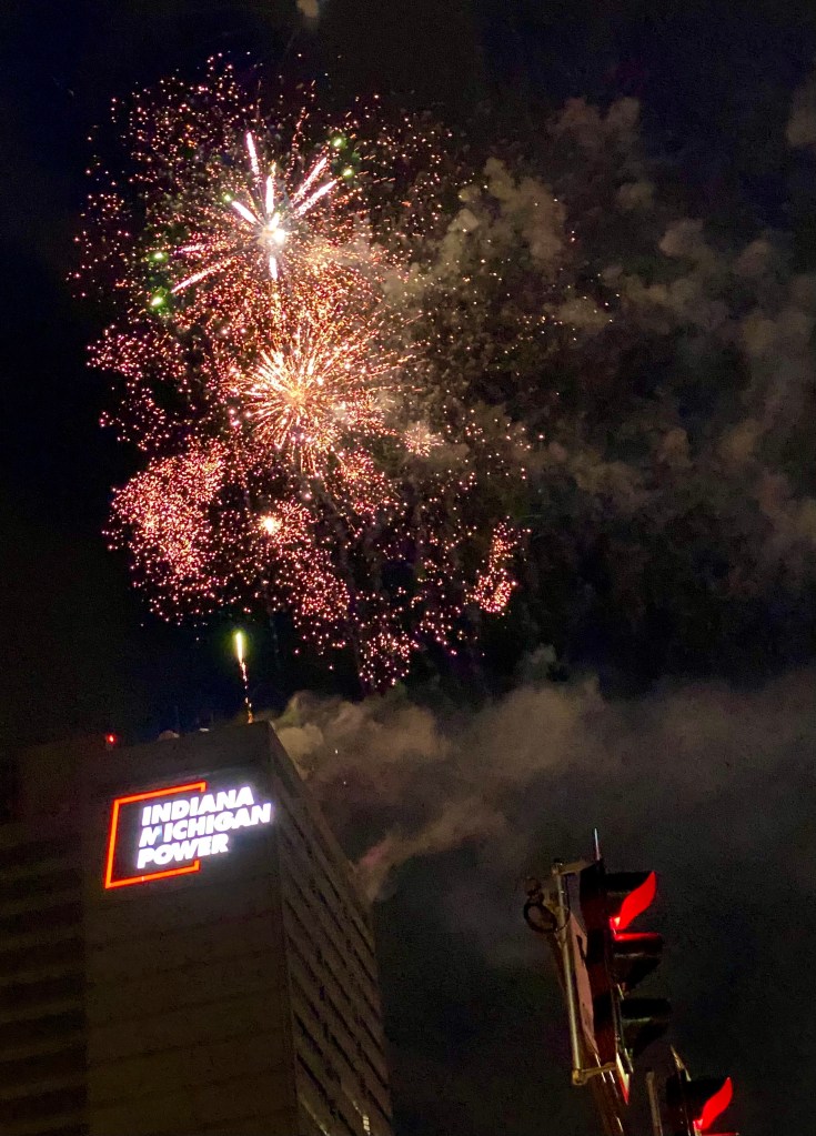 As I was preparing dinner, Dennis, the optimist he is, put the tablecloth on the outdoor table—we could eat dinner outdoors.  Although, this campground was smack dab in the middle of town, it is surround by huge trees, and you feel like you are out in the country.  About 1/2 hour before our guests were to arrive, a big fat rain cloud moved its way over us, and just started dumping loads of rain.  So much for outdoor dining!  Although, the rain finally stopped, we had a lovely dinner indoors, played some cards, and visited.  Around 9:30 p.m., we all left to watch fireworks downtown.  Fort Wayne is a town of many festivals, and they end these celebrations with a big fireworks display downtown.  Tom and Cami were prepared.  They had lawn chairs in their car, and we found a place to sit just a couple blocks from where they shoot them off.  Just before the fireworks started, a gentle rain fell, but did not hamper our enjoyment.