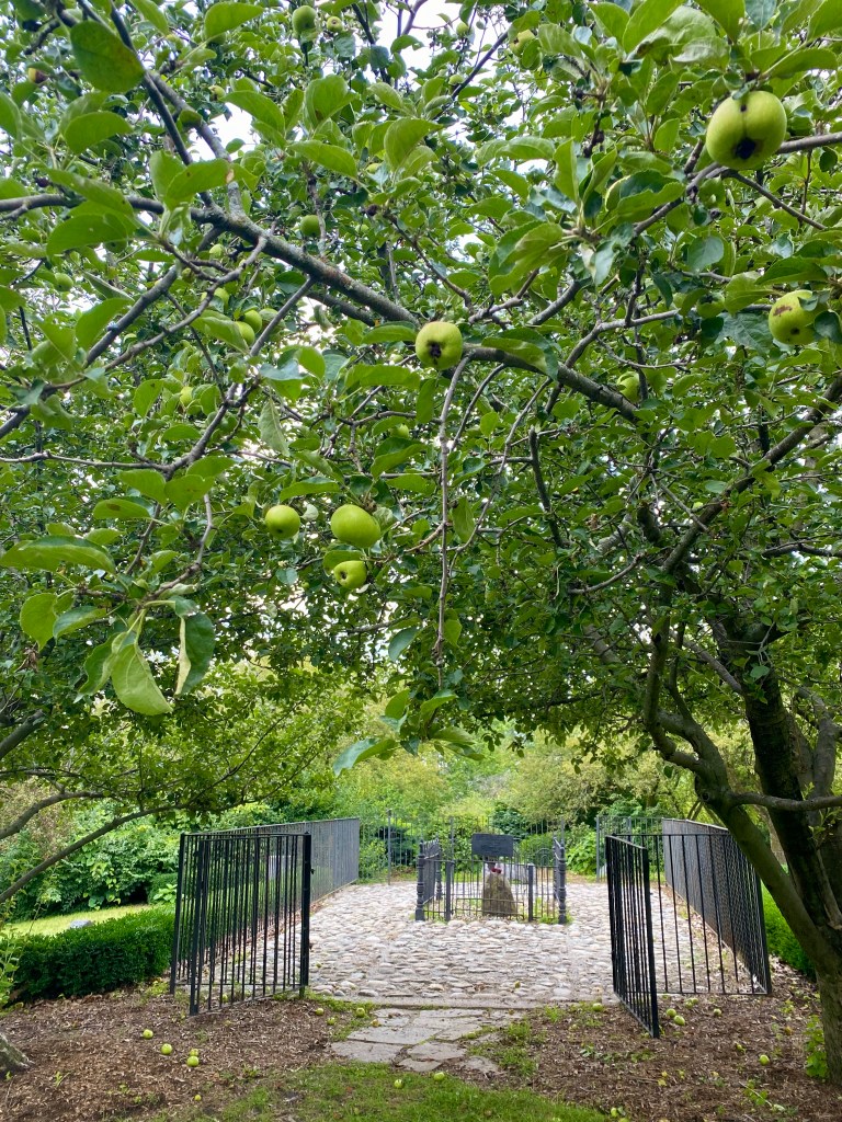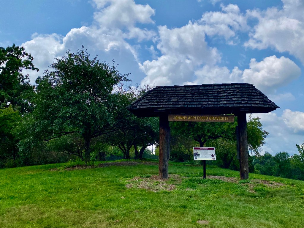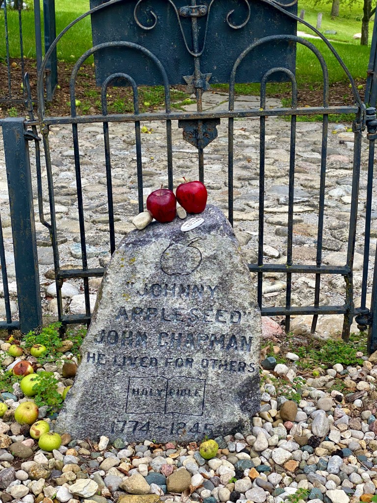 The following day we went to find Johnny Appleseed’s grave, which we were told was within the park grounds.  Of course, he was buried in what was probably an apple orchard, although now there are just a few apple trees around.  Johnny Appleseed (last name really Chapman) was born in Massachusetts.  His adult years he owned acres of land, mainly in Ohio, and planted orchards of apples.  He traveled around selling his young trees.  He died in Fort Wayne, Indiana.  The local baseball team renamed their team the Tincaps, in tribute to Johnny Appleseed and the pot he wore on his head as a hat.