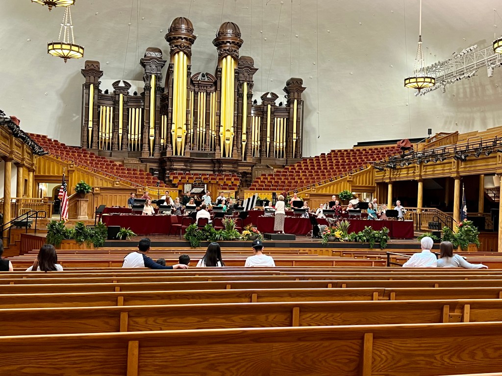 Inside the Tabernacle. The bell choir is practicing. You can see the huge are in from for the choir.
