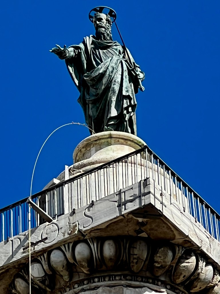 As we hiked around the city, we came upon the Parliament building and near it was Piazza Colonna or Column Square. There stands a large column erected in 193 A.D. in honor of Emperor Marcus Aurelius. It originally had a statue of Marcus Aurelius, but in 1598 Pope Sixtus V had the statue restored, but had the statue replaced with a statue of St. Paul. It’s kind of striking to see a monument to an ancient Roman leader who was Pagan, and have it remain basically the same except now it has a Christian figure on the top. The pope also did the same with he obelisk in front of the Pantheon–he had a cross placed on top of it with all the Egyptian writing below!