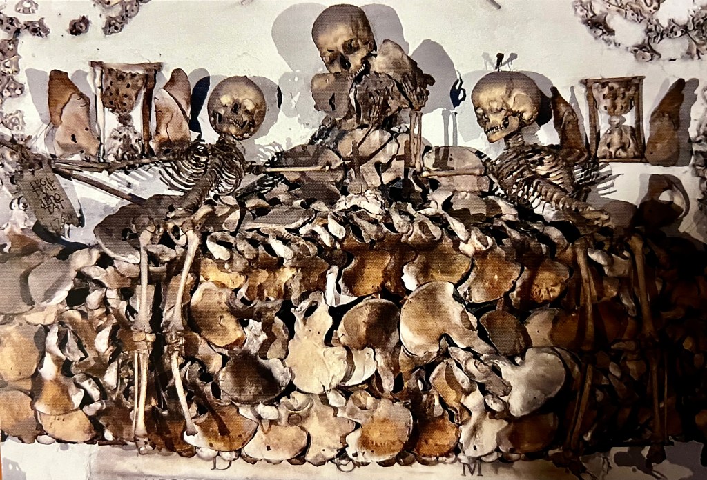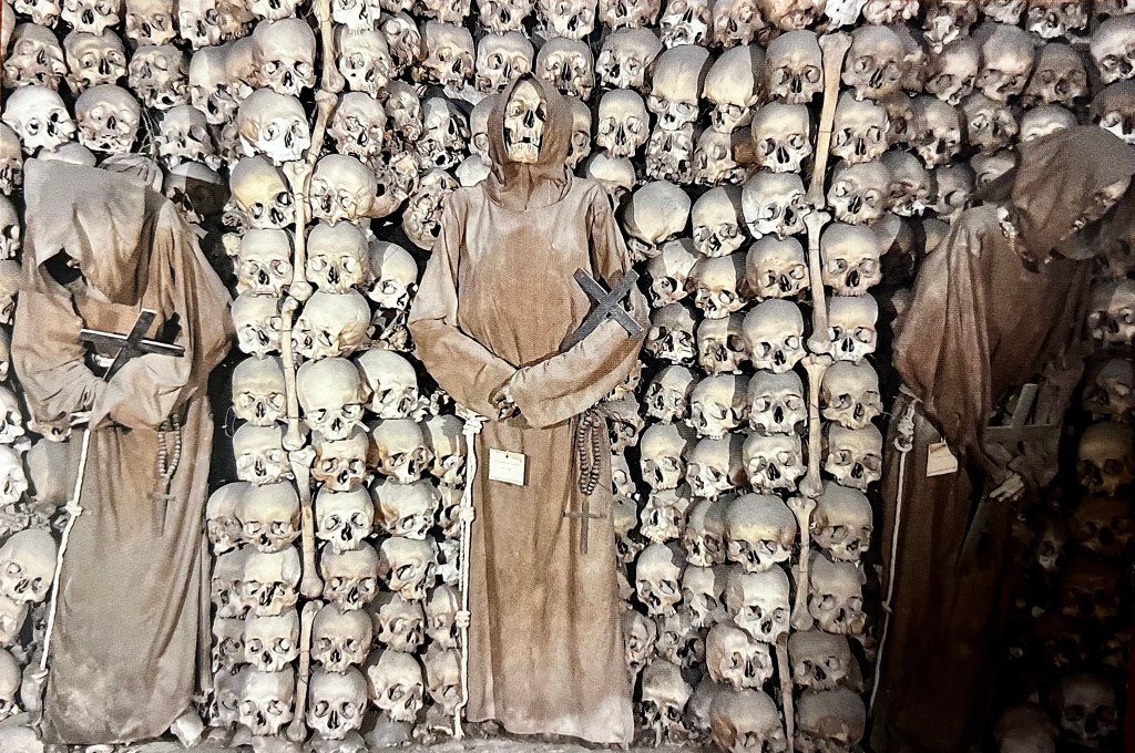 These are bones of the monks of the Capuchin order whose bones were designed in these displays. It’s rather odd, in my opinion, but not creepy, just odd that this is how they chose to inter the bones of their clergy.