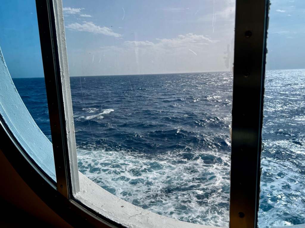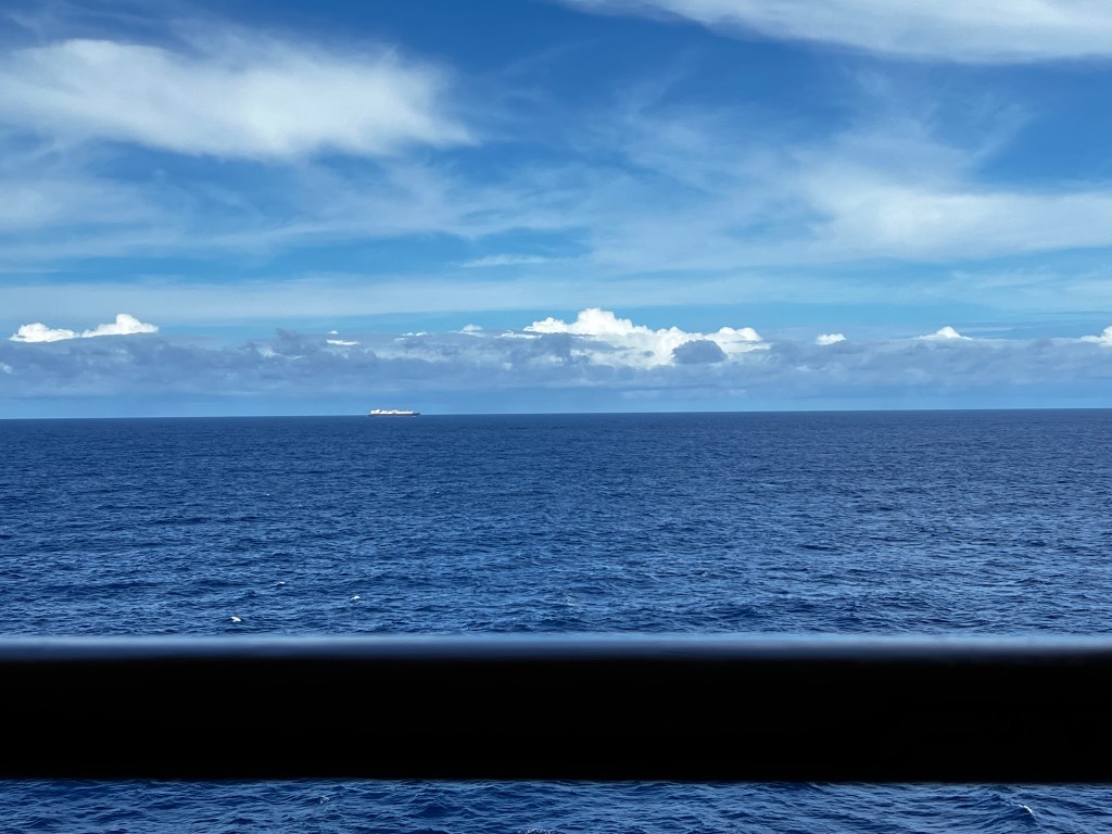 Sailing across the Atlantic was calm and alone, but once in a while we would observe another ship in the distance. Do you see the ship in the distance?