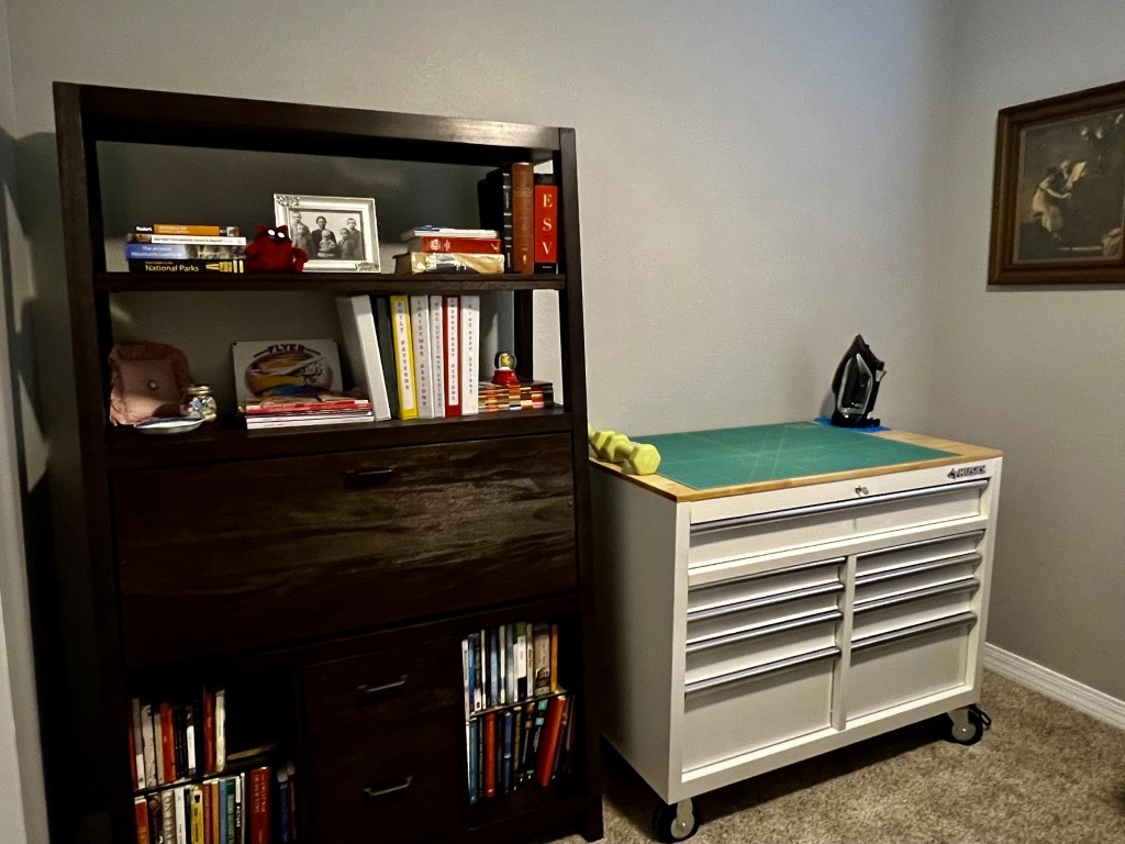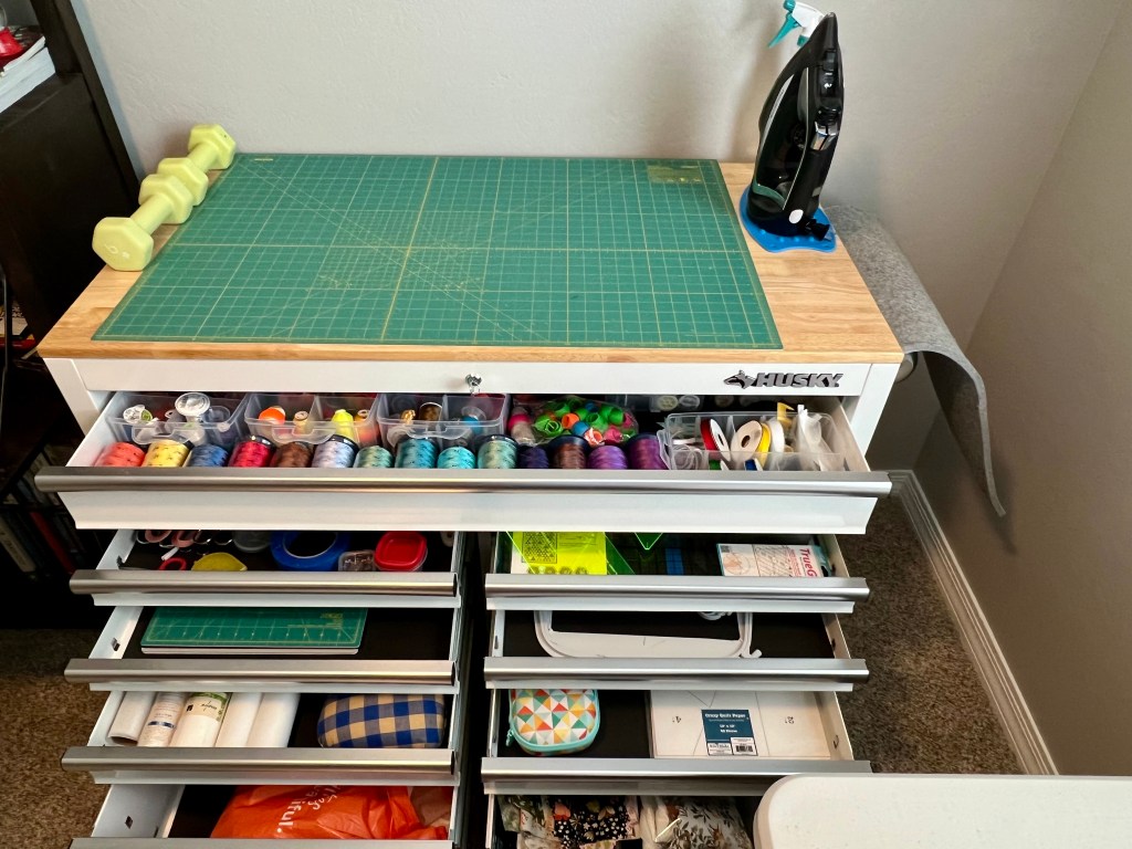 I absolutely love my tool cabinet for my sewing supplies. It is counter height so cutting with my rotary cutting on the mat is better for my back than bending over a table height area. The drawers are perfect for all my sewing/embroidery accessories.