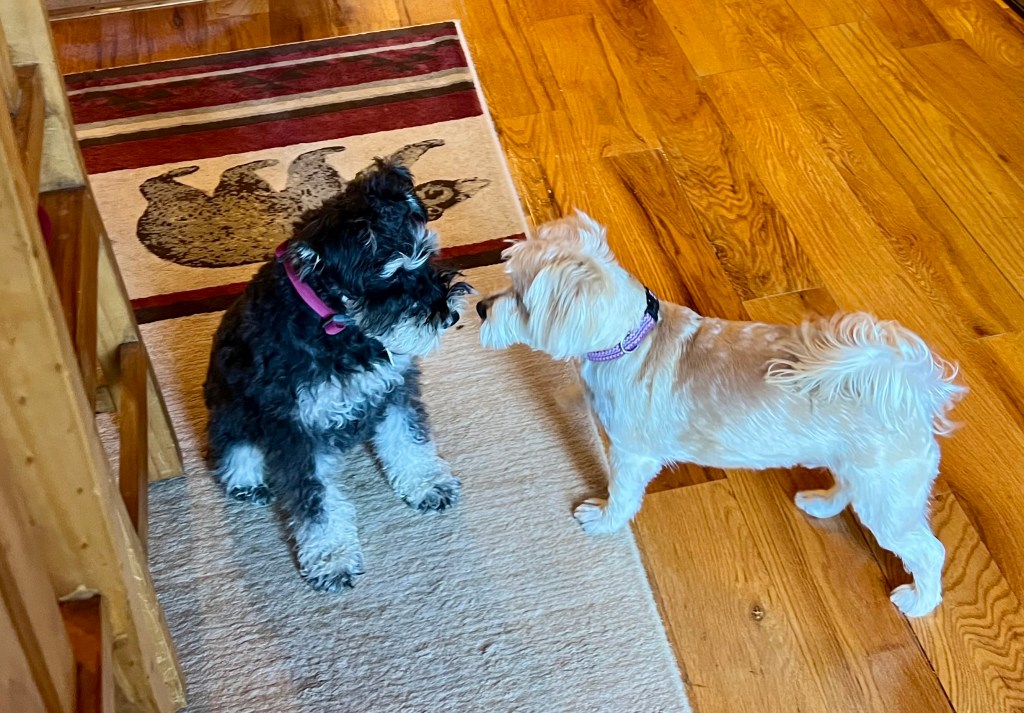 He met a number of dogs visiting family, but his favorite of all was Heidi, a sweet miniature Schnauzer.  He played with her constantly while we visited a few day in Georgia.