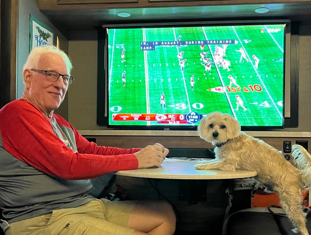 Dennis and Charlie watching the Chiefs early in the season while in the RV.