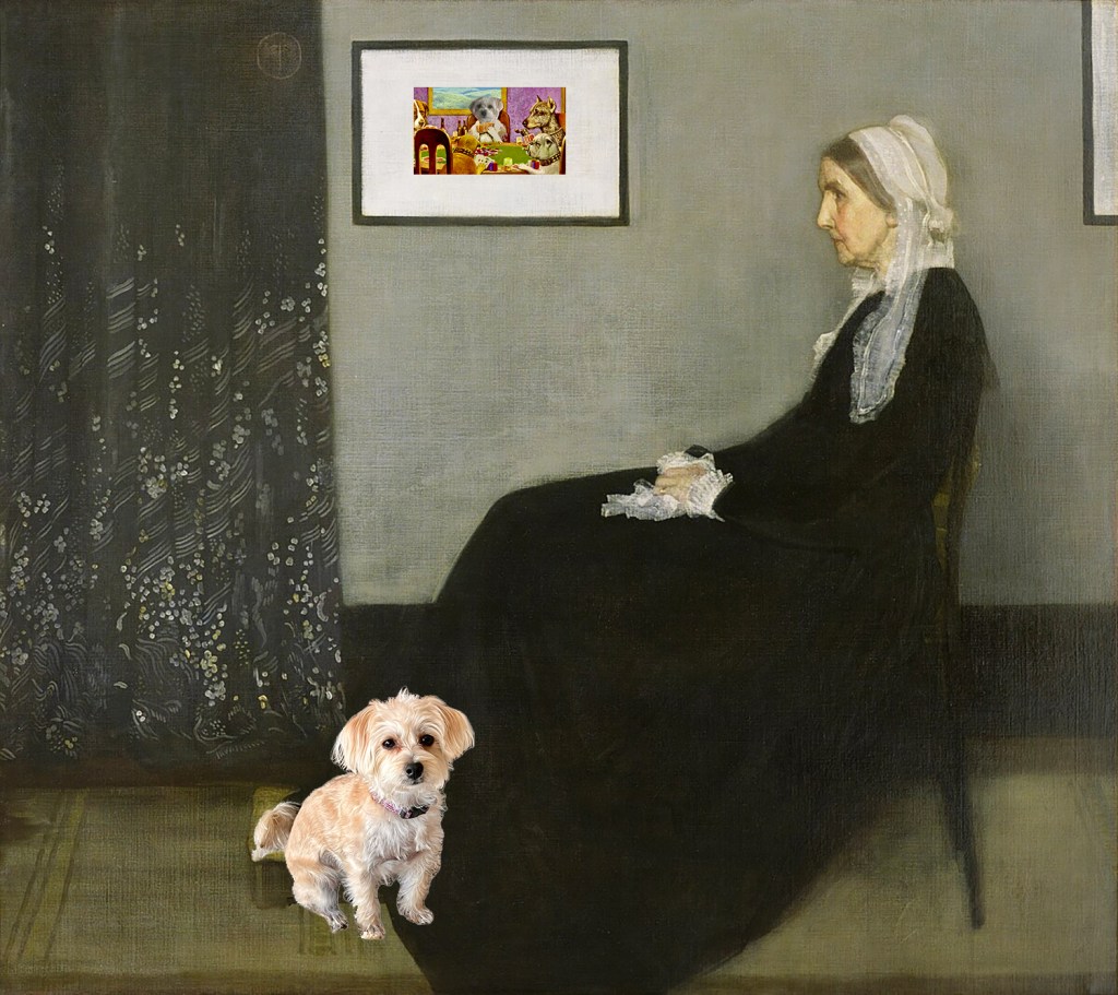 Please notice that not only is Charlie at the feet of Whistler’s mother, but she has hung a picture of Charlie playing cards!
