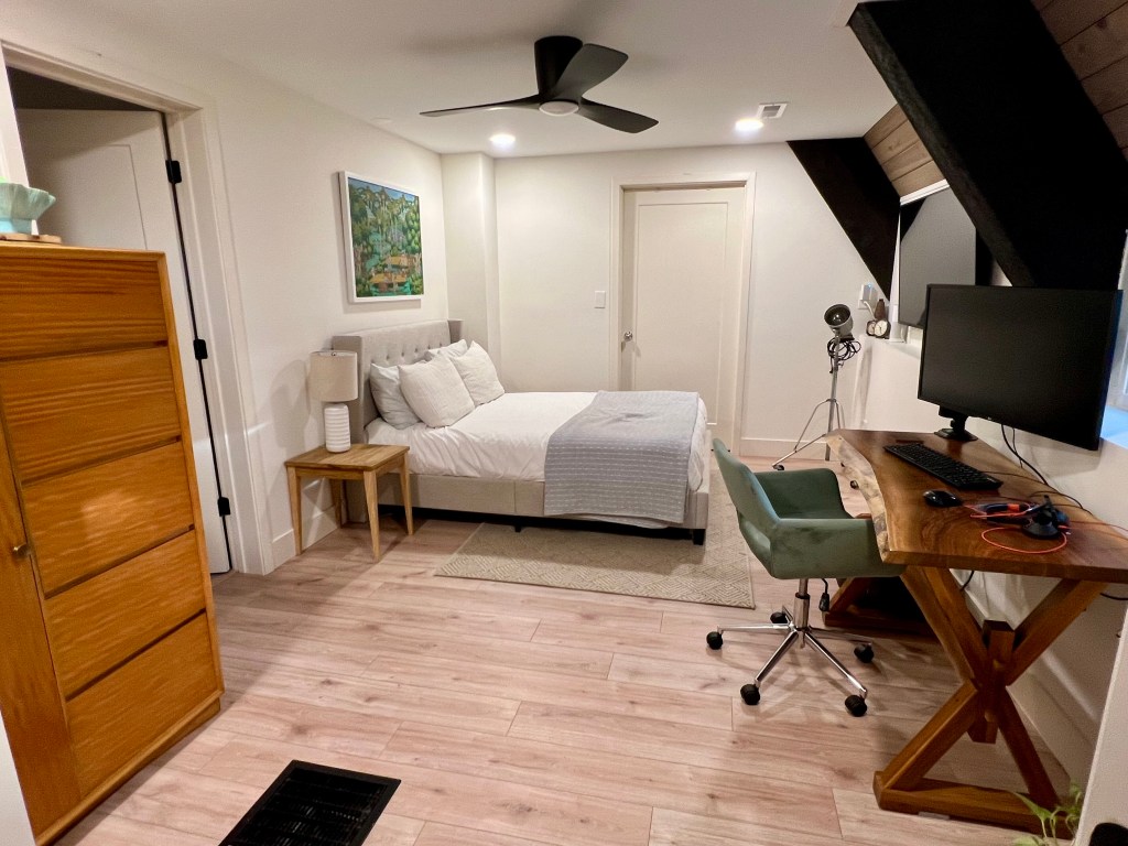 This bedroom was once the small kitchen in the church. The room was widened and a bathroom attached.